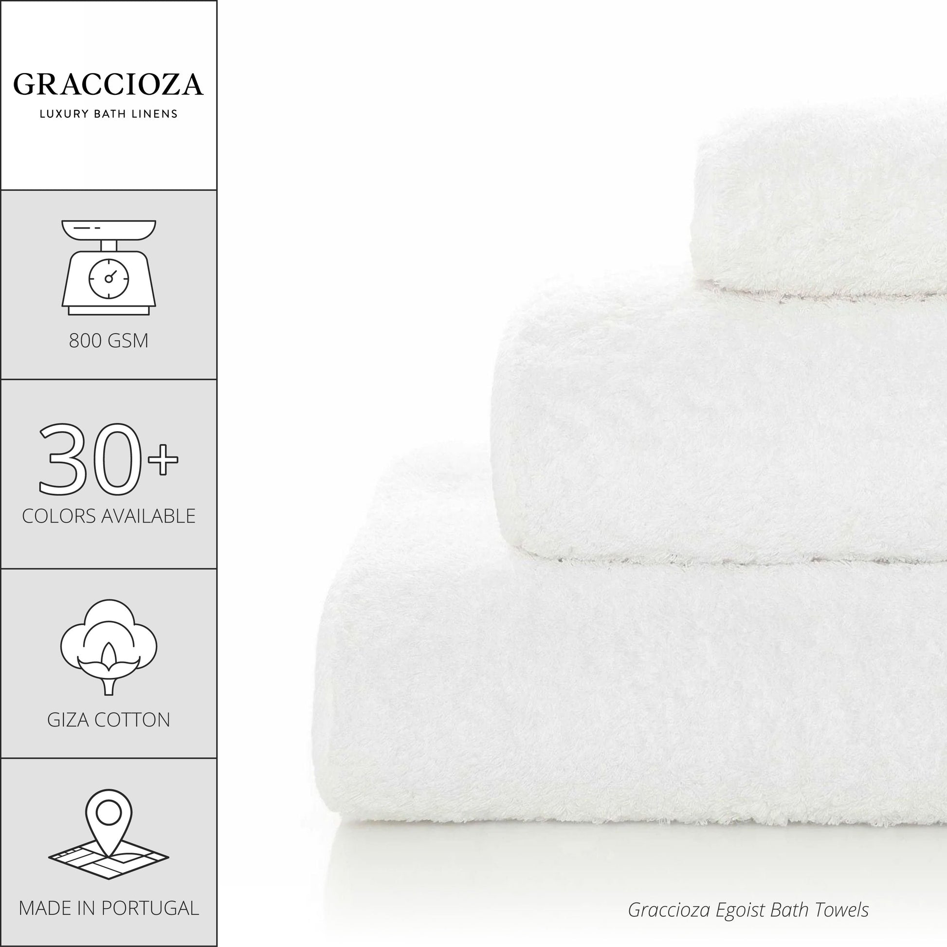Graccioza's Egoist Bath Towels are truly for those looking for the utmost luxury. Made of 800GSM 100% Extra Long Staple Egyptian Giza Cotton, the finest yarn in the world, these towels provide a wonderfully soft feel and the highest absorbency. The Egoist towels are extremely unique in that they are treated with a special formula from BeSoFresh to be antibacterial. This treatment inhibits bacteria and fungus growth and protects from odors for long-lasting freshness. For more information regarding the BeSoFresh antibacterial treatment, see the CHT company website here: CHT BeSoFresh.