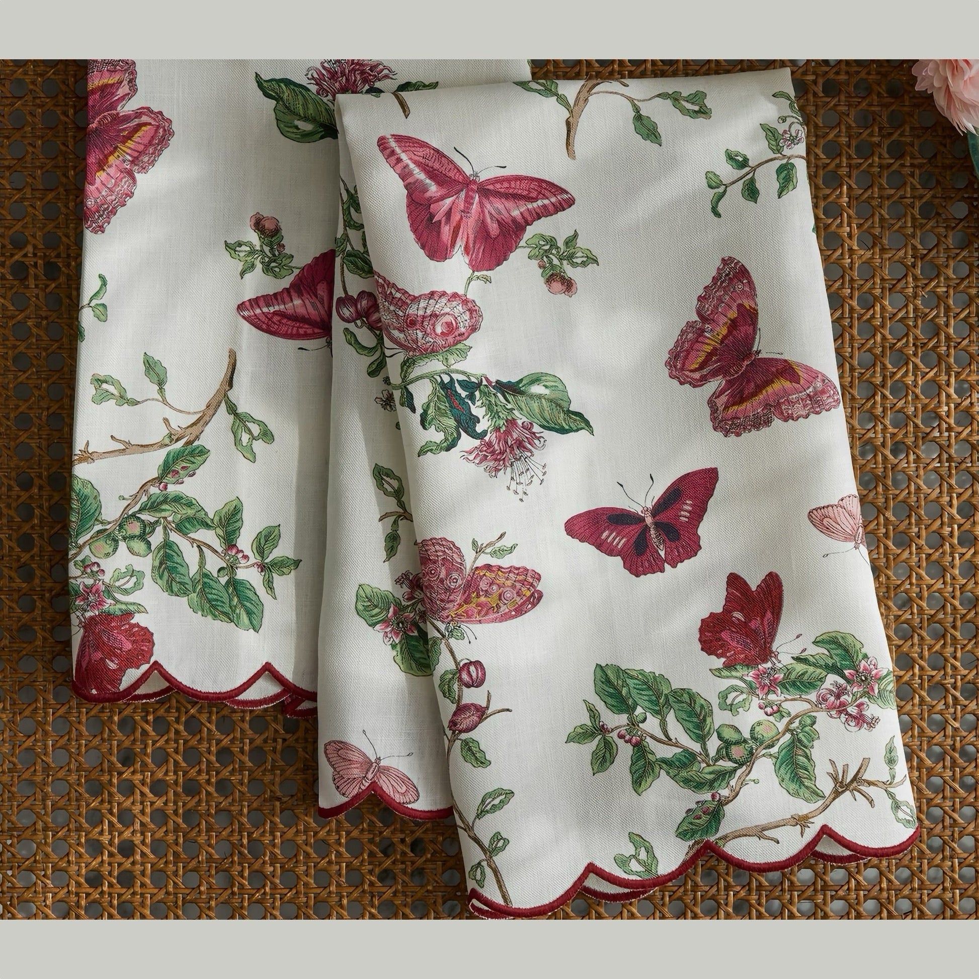 Baudin Butterfly is a delightful Matouk Schumacher print with an enchanting mix of butterfly and botanical motifs. The Matouk Schumacher Baudin Butterfly Guest towels are elegantly finished with a scalloped trim, adding an extra note of refinement.