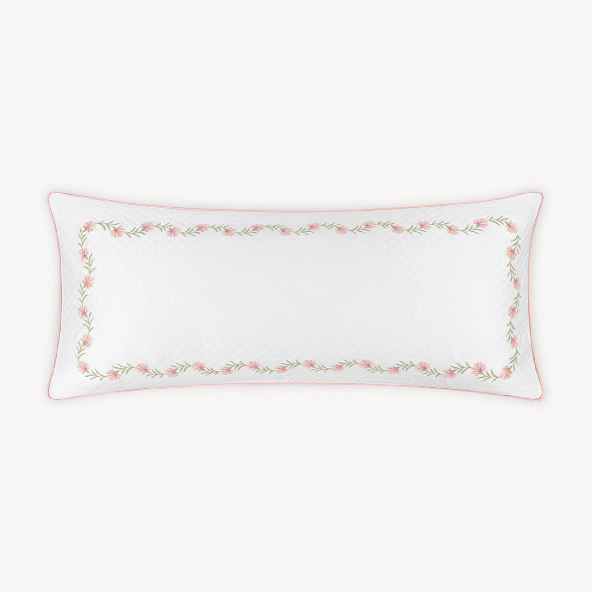 Embroidered with a trailing flower motif, the Matouk Daphne Matelasse Lumbar Pillow Cover adds delicate charm to their Petra diamond matelasse, creating a collection staple. This style is designed to coordinate with the coveted Daphne sheeting collection. It has a soft hand-feel, a light sheen and fluid drape.