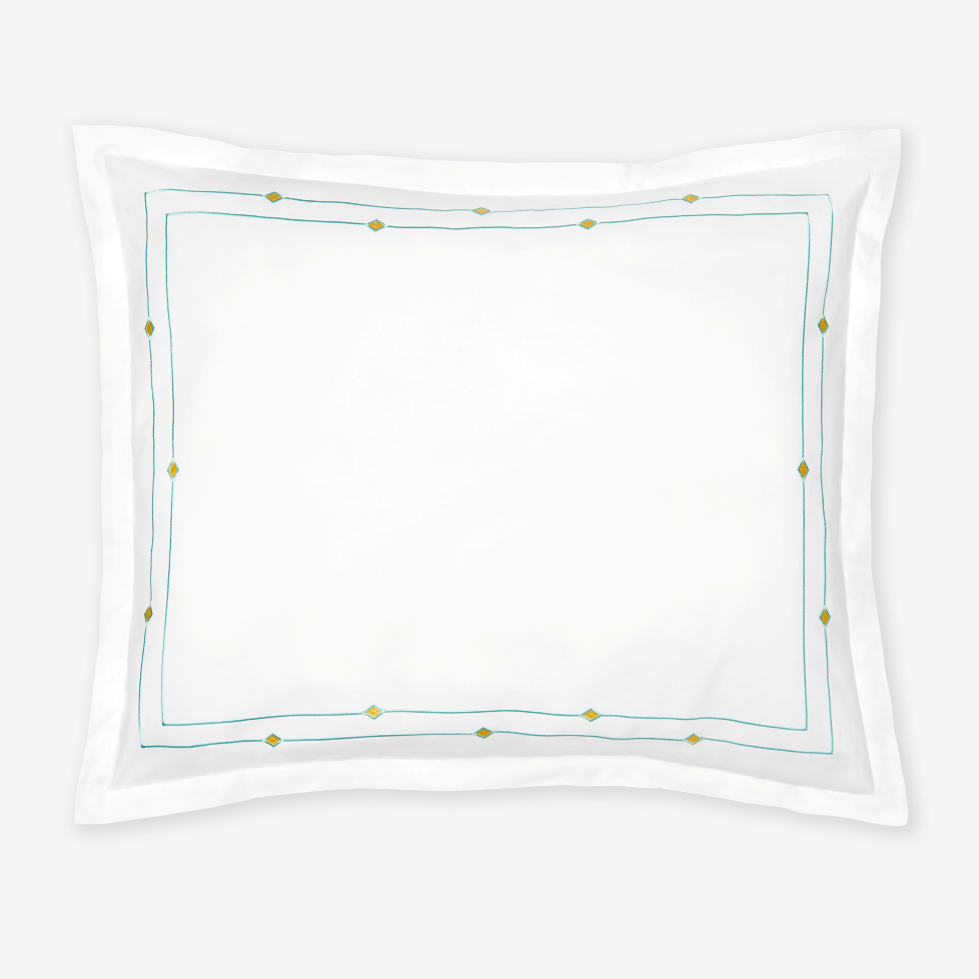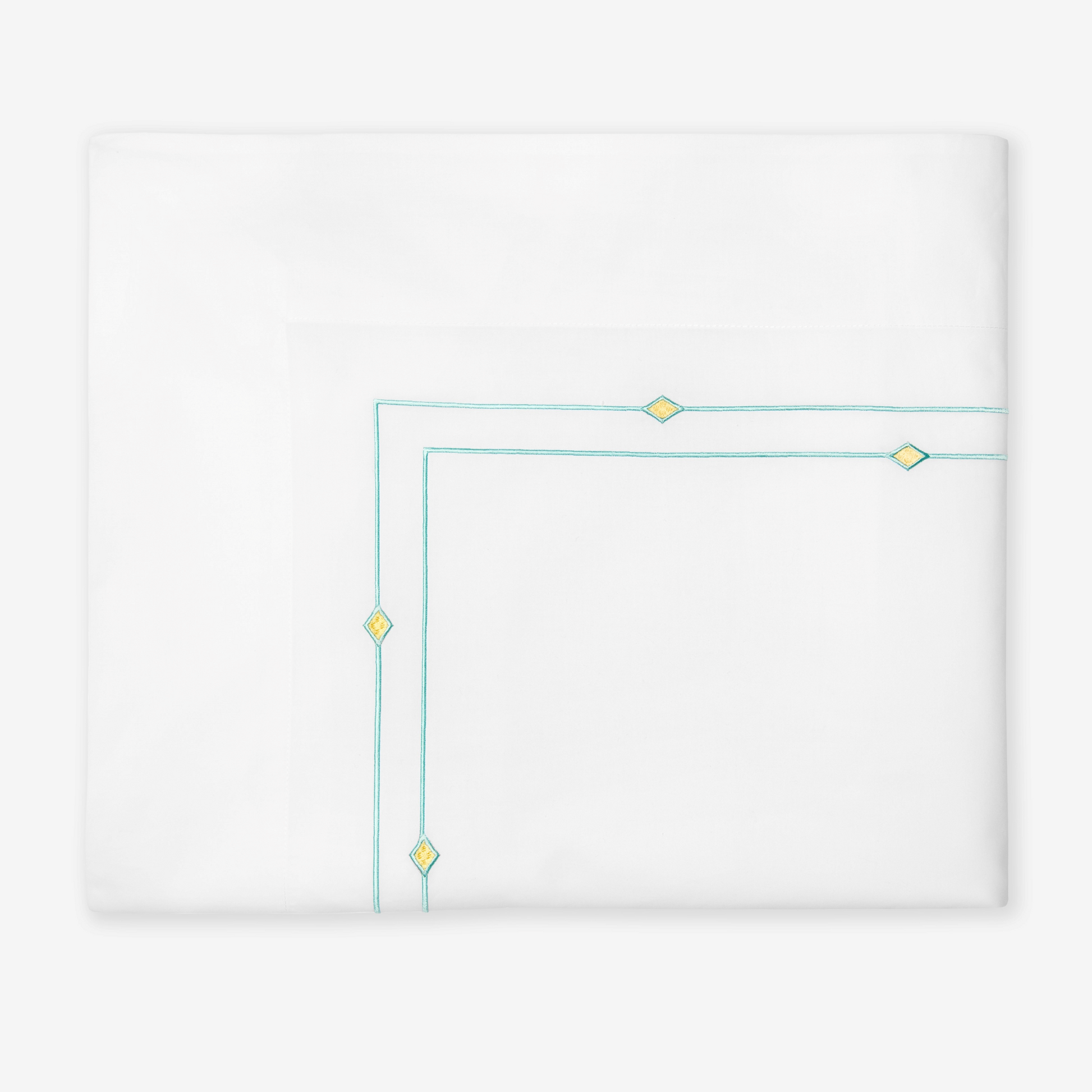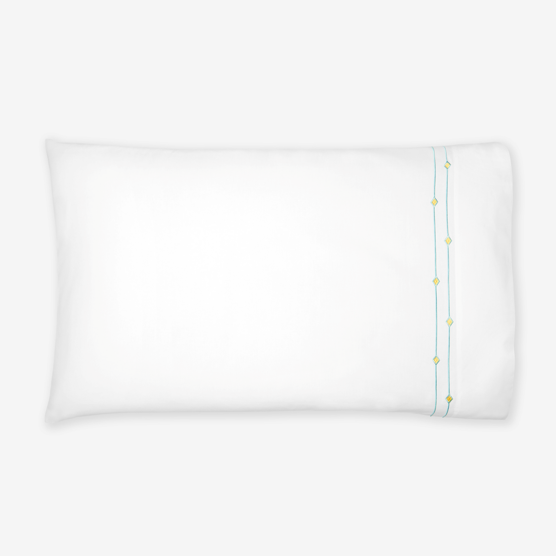 Sferra's Diamantini Bedding's satin-stitch double border of aqua, accented by yellow diamond details, imbues the style with a sense of playful sophistication. The Diamanti Bedding style pairs beautifully with Sferra's whimsical Geometrico collection for a finished look that brings a youthful spirit to the bedroom.