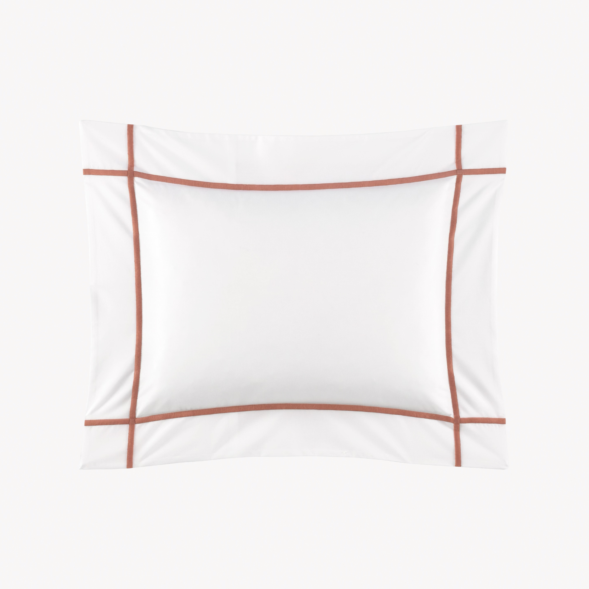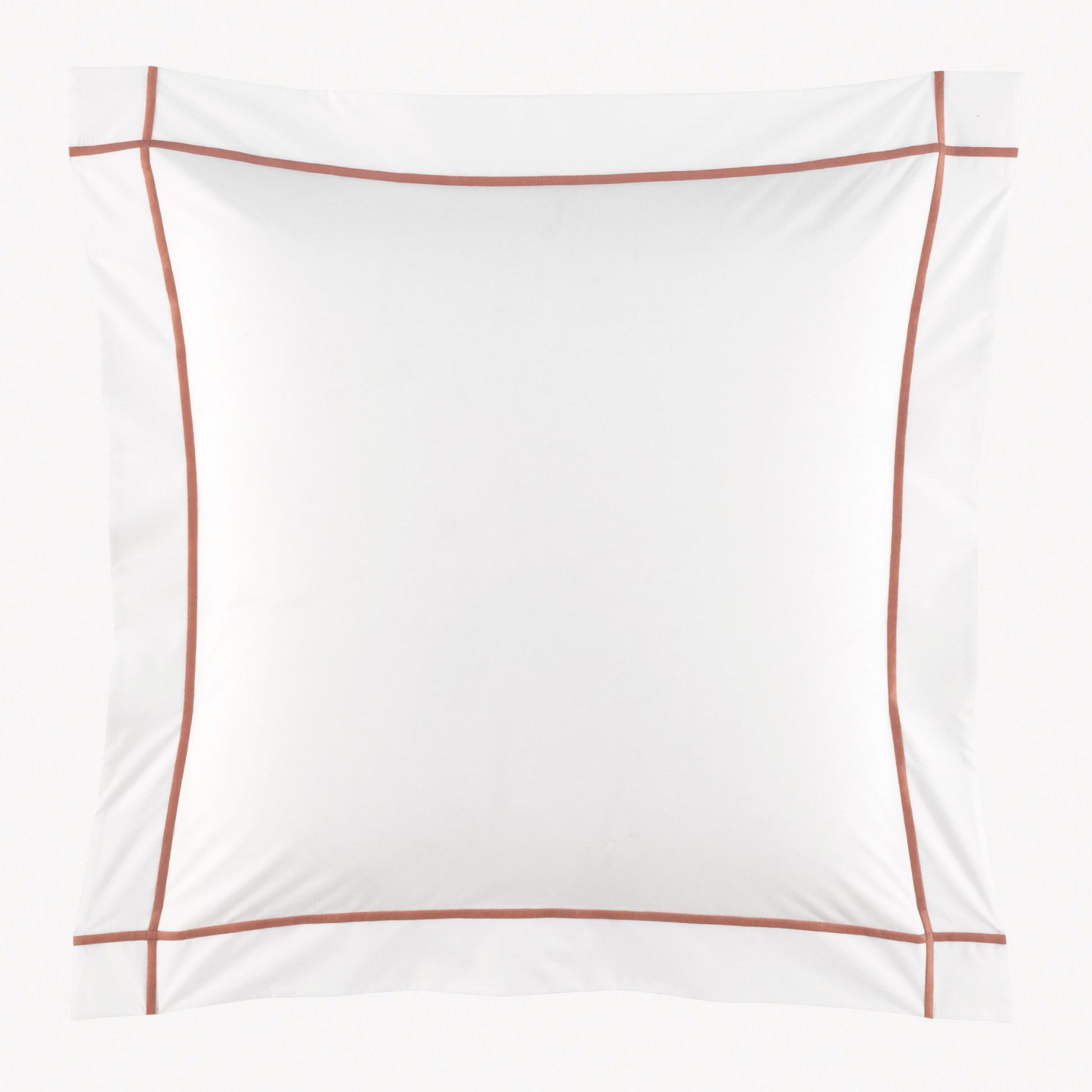 Athena, goddess of handicraft and weaving, inspires and signs the luxurious identity of this Yves Delorme timeless classic design. A crisp, resistant, sophisticated, and matte finish guarantees the excellent quality of this textile. The pure graphic expression of a colored bourdon stitch frames the flanged pillow shams and duvet cover in an elegant gesture of crossed lines.