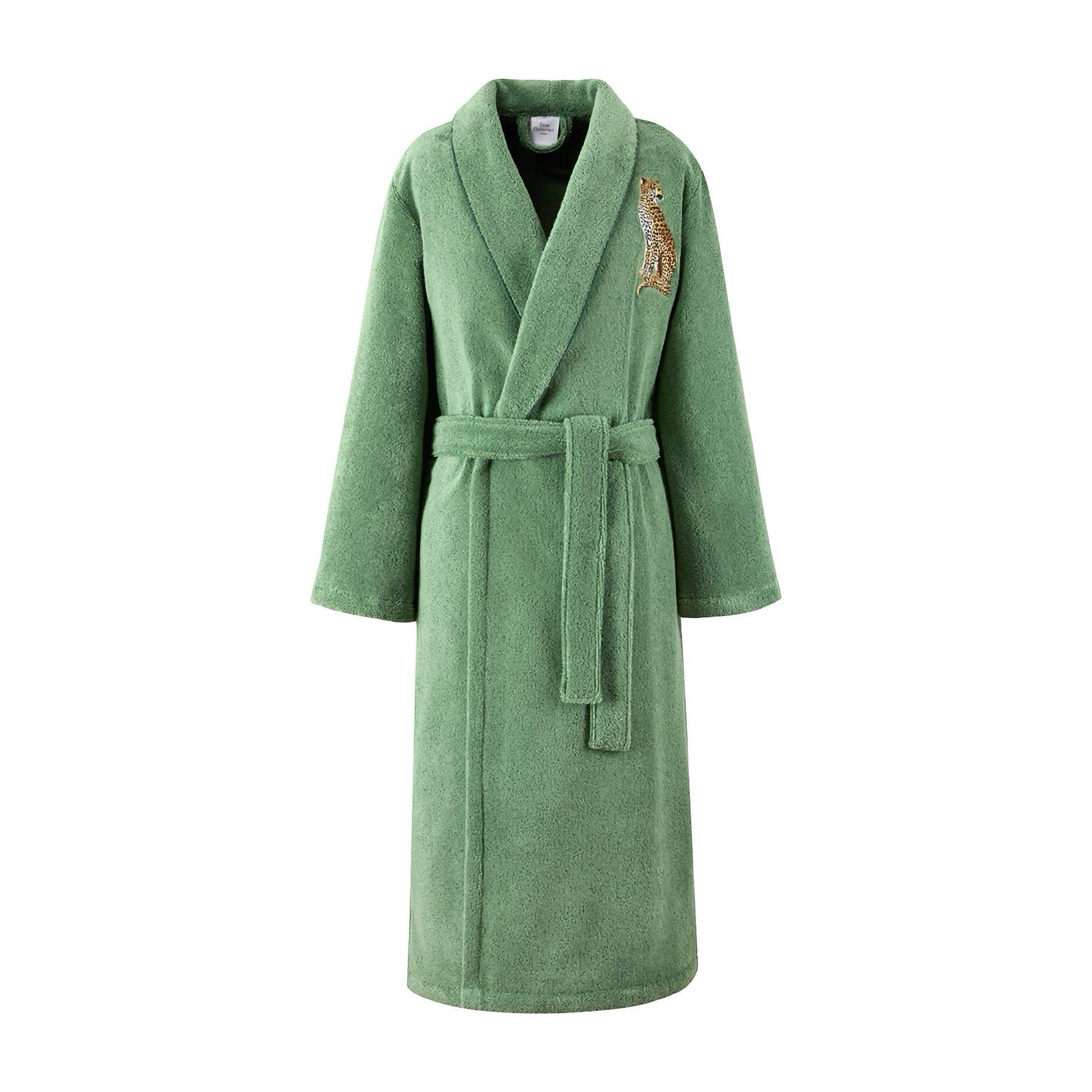 - Shawl collar bathrobe with embroidery on the chest, piped finish, inside pockets and belt.