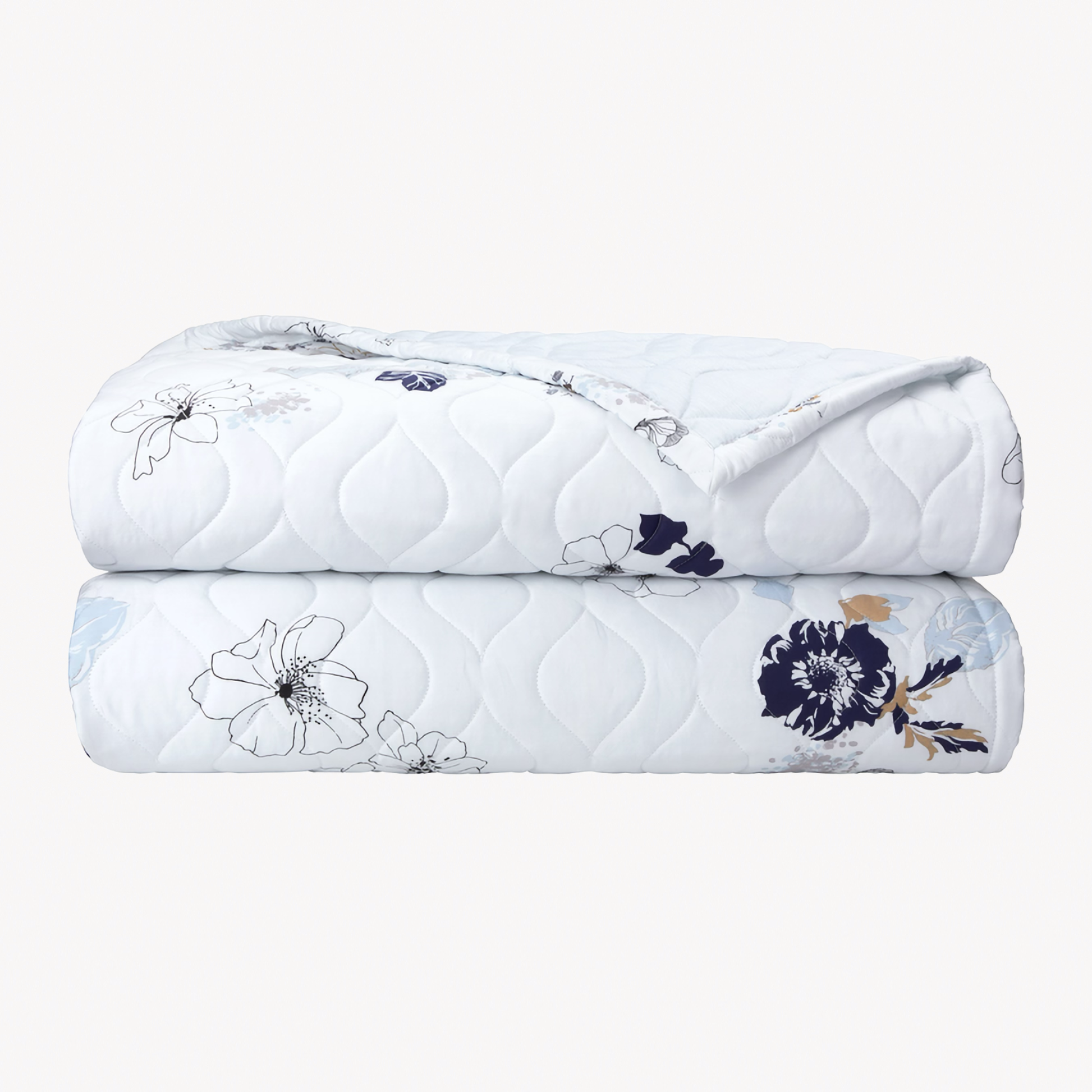 The Yves Delorme Eclipses Bedding style evokes a moonlit evening, with flowers appearing as shadows on white sateen. Shades of midnight blue, sand, and sky intertwine to create a pattern that is both poetic and modern.