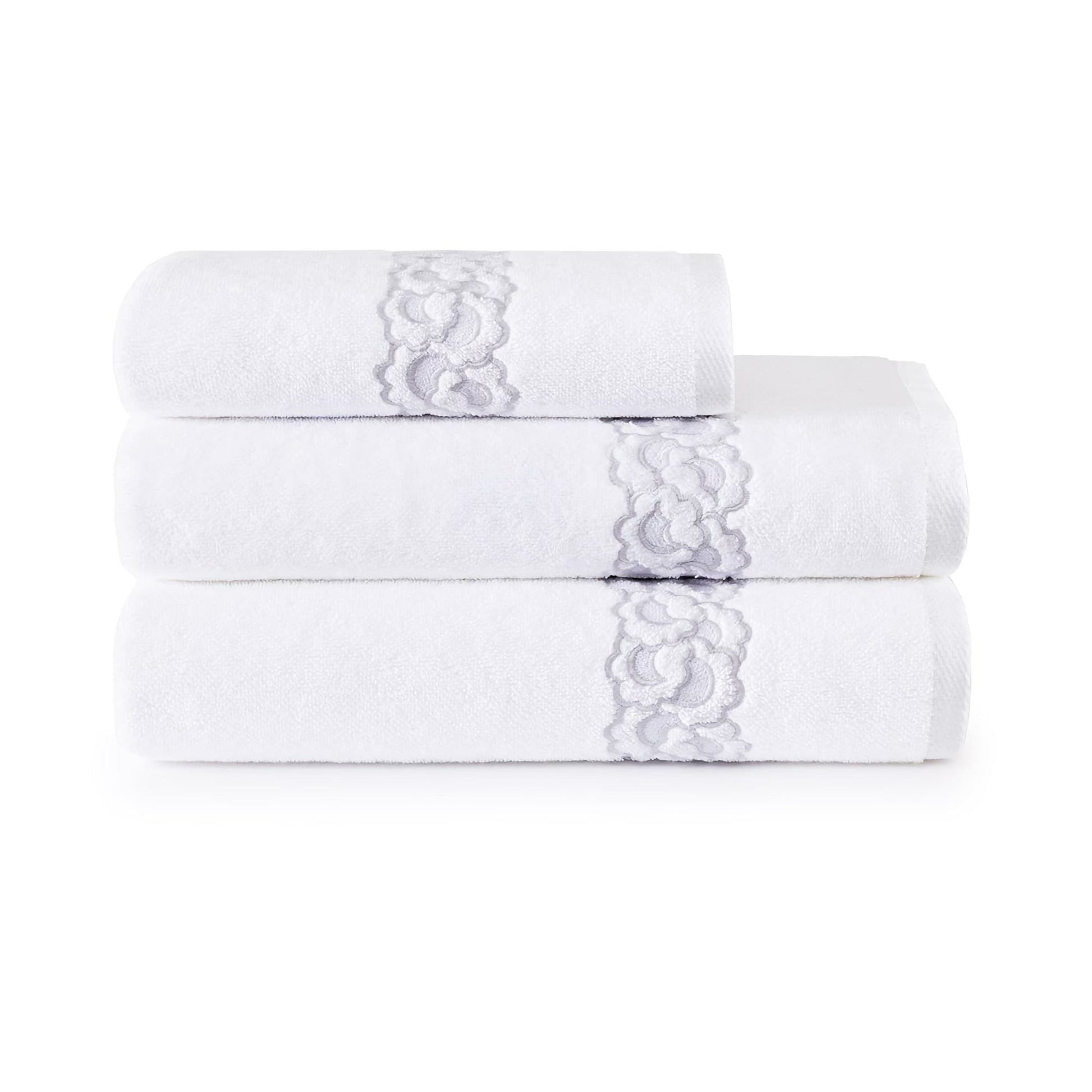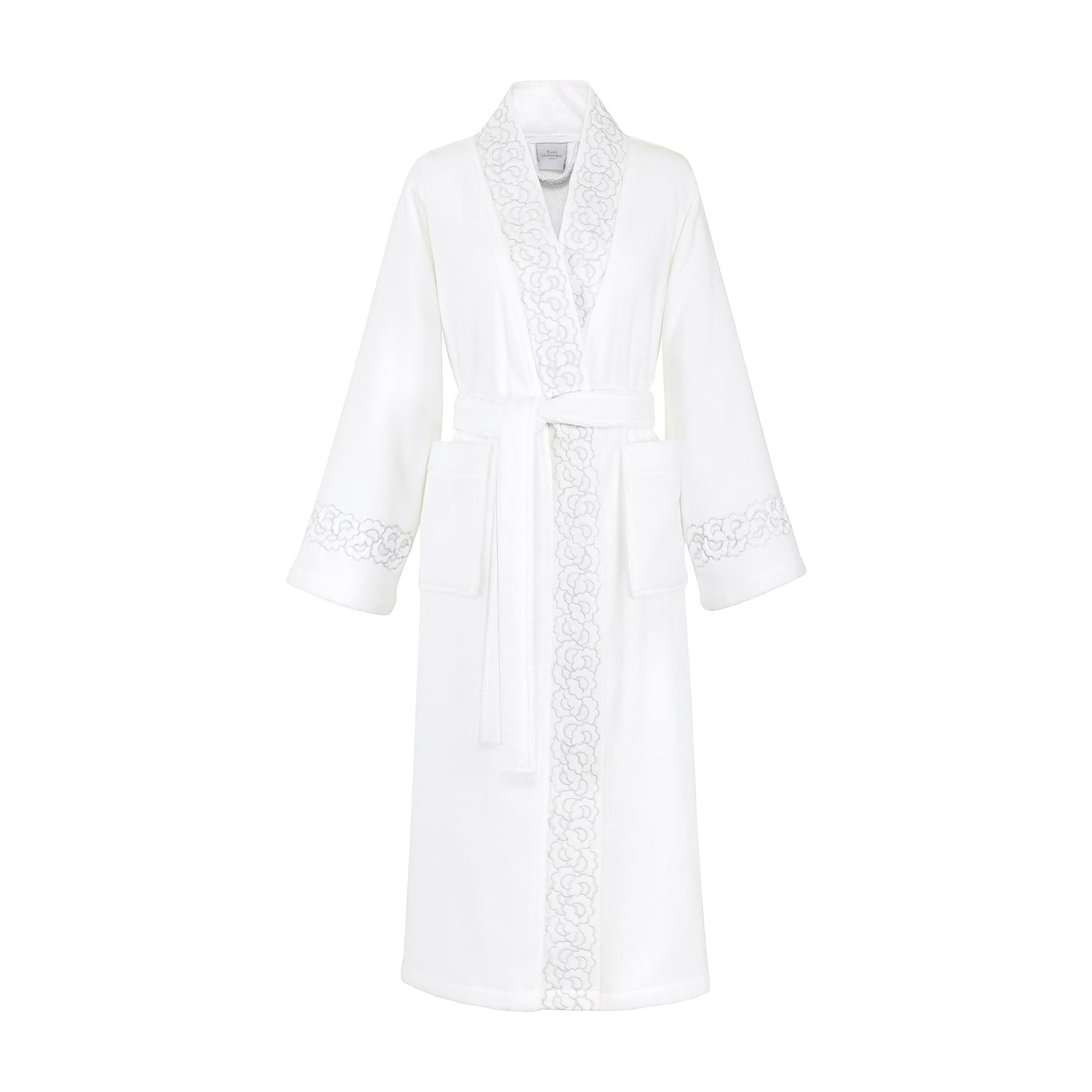 These elegant towels and bath robe pair well with the Yves Delorme Festons Bedding Collection for a complete look.