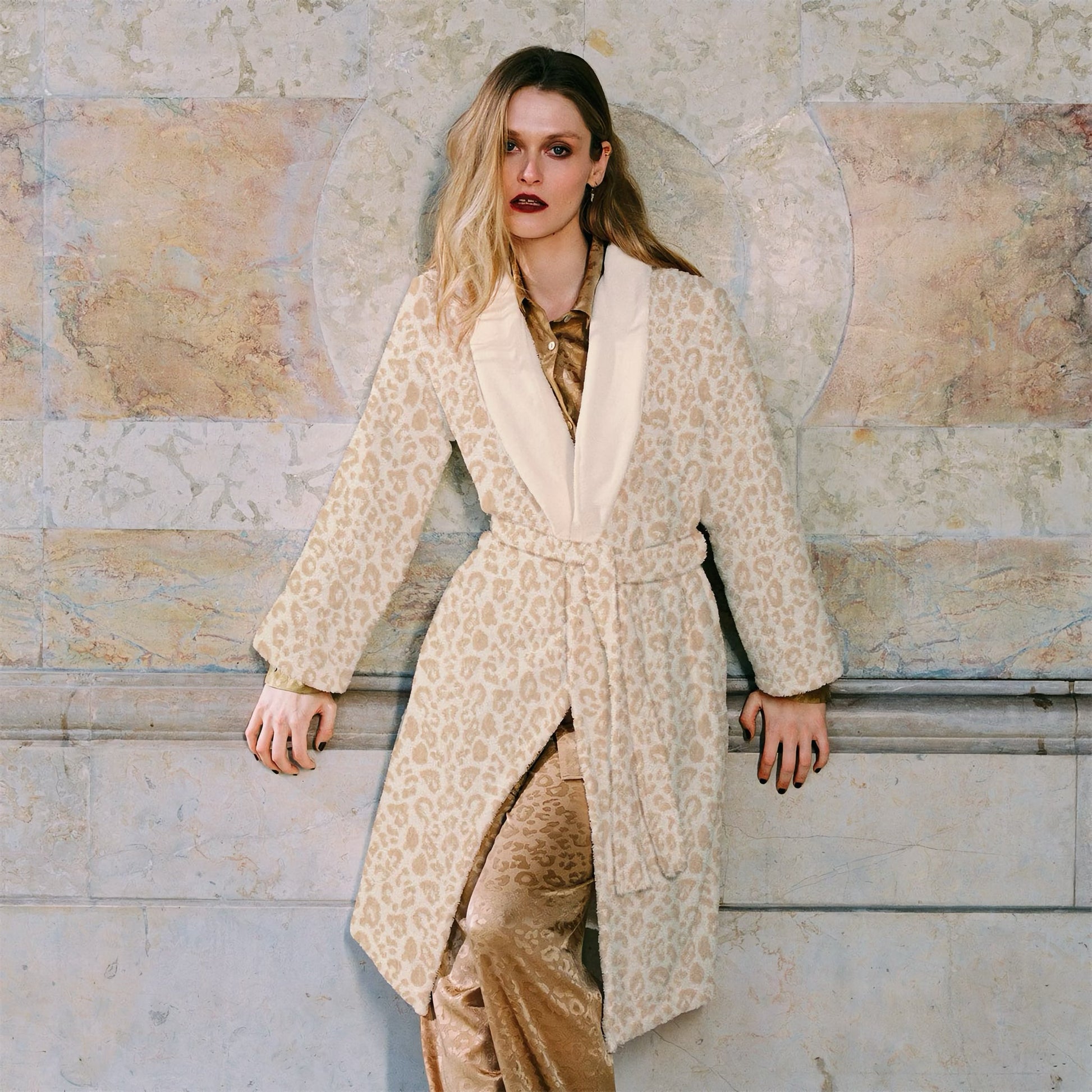 The Yves Delorme Leopard Bath Robe is a play of textures and wild spirit, revealing a snow leopard motif woven in sculpted velvet jacquard. Made from organic cotton, the robe offers enveloping softness.