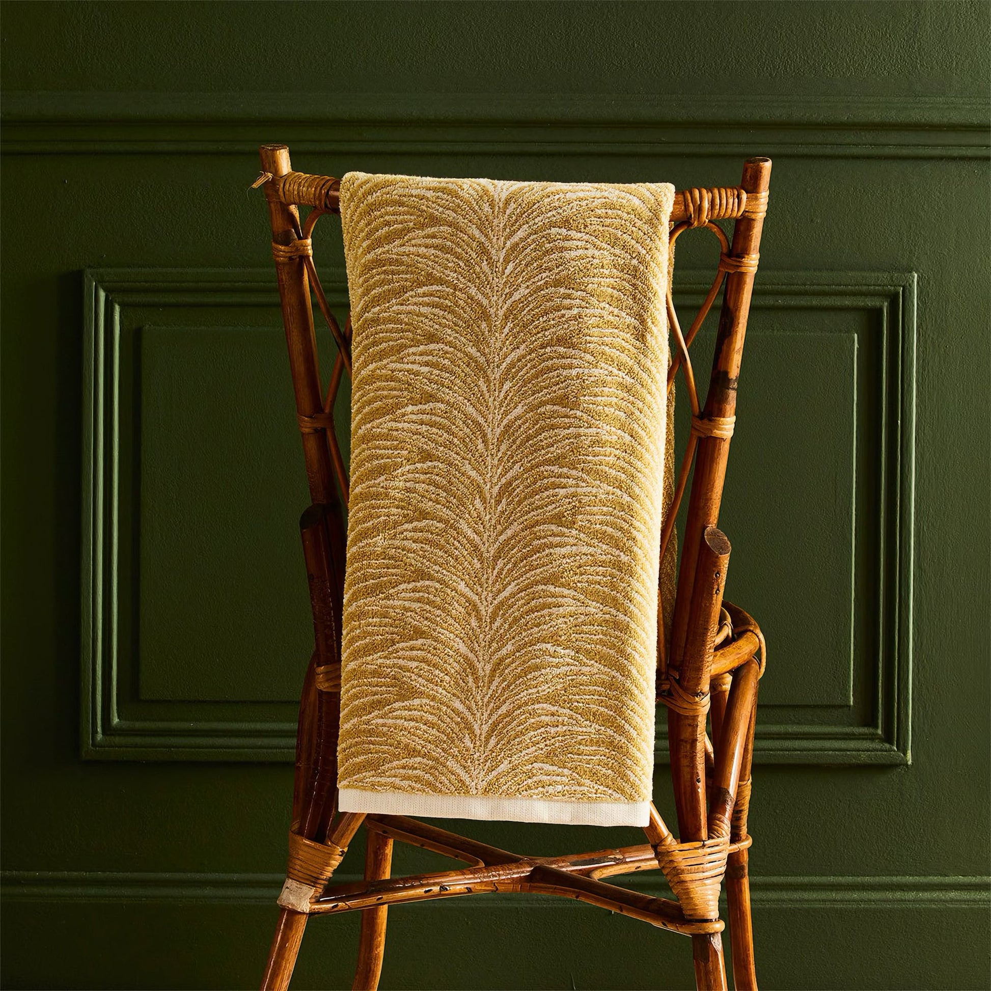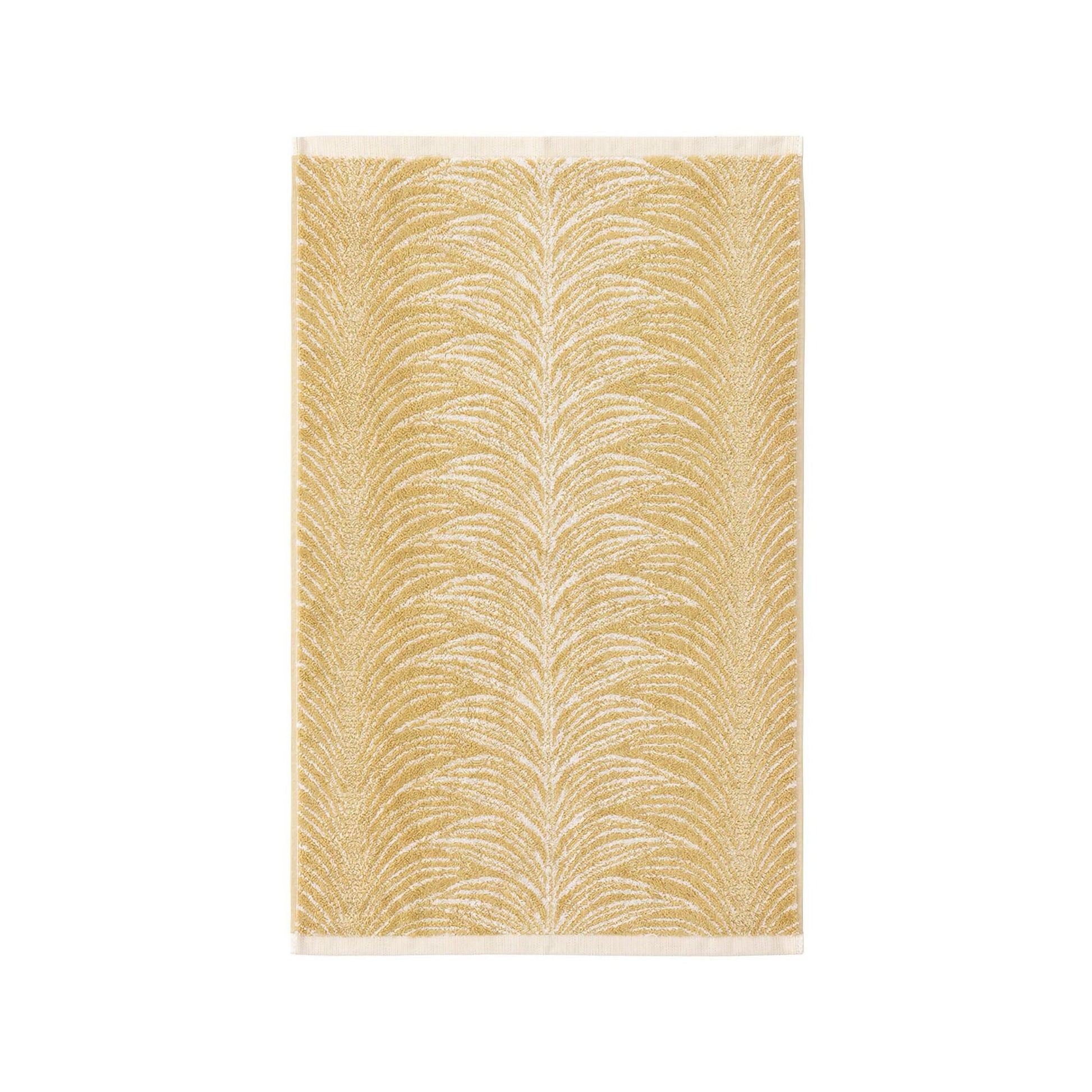 The Yves Delorme Pollen Bath Collection is a patterned towel style that shows hazel blossoms scatter their pollen in subtle plays of light across the terry cloth, creating a natural and graphic motif that brings a poetic touch to the bath space.